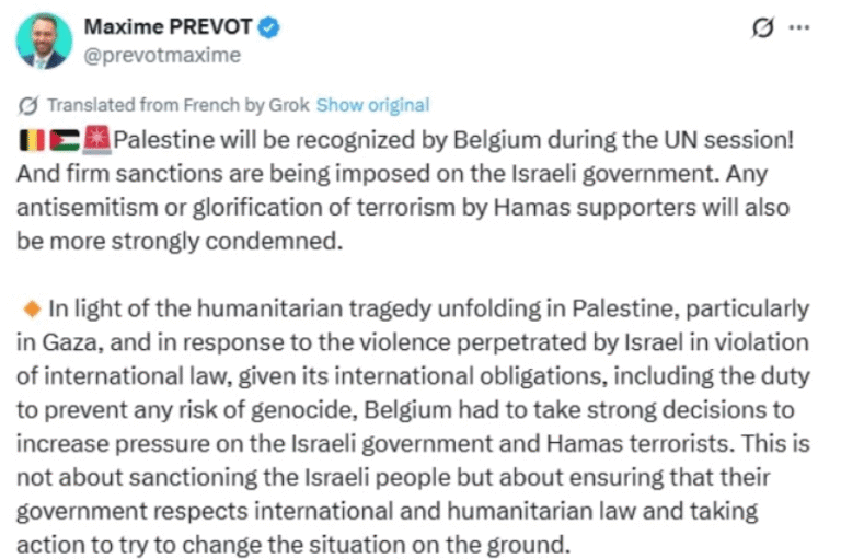„Палестина ќе биде признаена од Белгија на седницата на ОН! Против израелската влада ќе бидат воведени силни санкции“, напиша Прево на социјалната мрежа Икс.