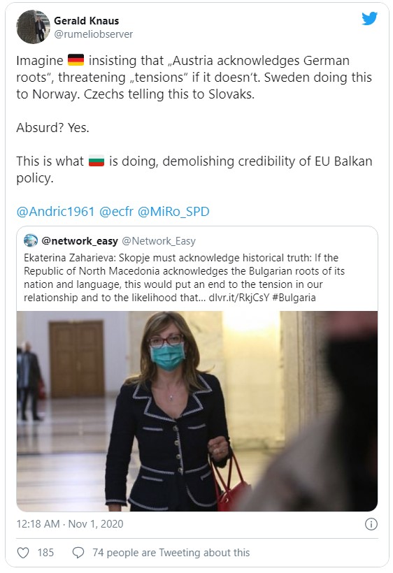 „Замислете Германија да инсистира ‘Австрија да ги признае германските корени’, заканувајќи се со ‘тензии’ ако не го направи тоа. Шведска да ѝ го прави тоа на Норвешка. Чесите ова да им го кажат на Словаците. Апсурдно? Да! Тоа е она што го прави Бугарија, уривајќи го кредибилитетот на политиките на ЕУ за Балканот“, напиша Кнаус на Твитер.