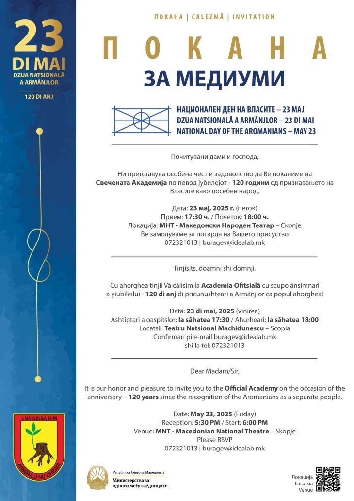 Настанот под слоганот „120 години – Столб на балканската историја, сегашност и иднина“ е во организација на Министерството за односи меѓу заедниците во соработка со влашките здруженија, културни институции и јавни организации. Оваа манифестација, како што информираат од Министерството, претставува можност да се прослави истрајноста, идентитетот и културното богатство на влашкиот народ, кој преку генерации оставал длабок печат во општествениот развој на Македонија.