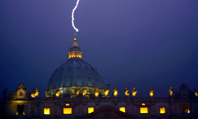 Откако Папата Бендедик Шеснаесетти ја шокираше јавноста со неговата оставка, бура со дожд го погоди Рим, а тоа што следеше, некои го толкуваат како знак. Во куполата на базиликата Свети Петар во Ватикан удри молња