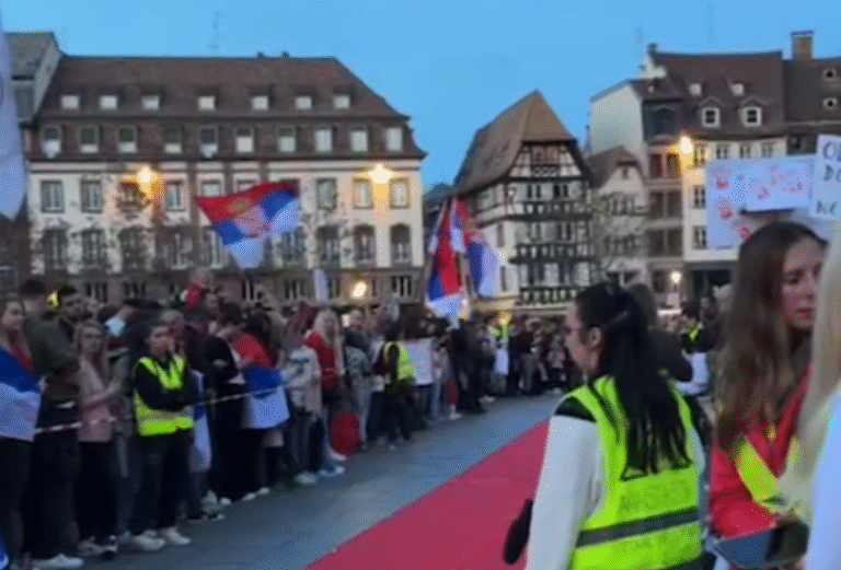 Стотици луѓе попладнево се собраа на плоштадот „Клебер“ во Стразбур за да ги пречекаат српските студенти кои пред 13 дена тргнаа со велосипед од Нови Сад, како израз на протестот и барањата за правда за падот на настрешницата во српскиот град лани во ноември, во кој загинаа 16 луѓе.