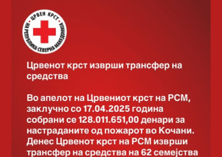 Црвениот крст соопшти дека од донации досега се собрани вкупно 20.932.654,00 денари за поддршка на настраданите во пожарот во Кочани.