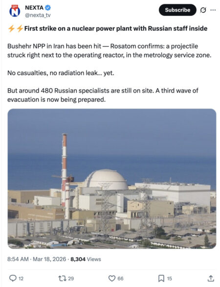Иранската нуклеарна електрана Бушехр била погодена од проектил, потврди руската државна корпорација за атомска енергија „Росатом“.