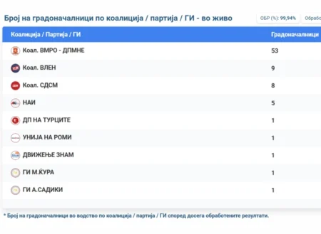 ВМРО-ДПМНЕ и Коалицијата на вчерашниот прв круг од локалните избори победи во вкупно 53 општини, Коалицијата ВРЕДИ во 9, СДСМ…
