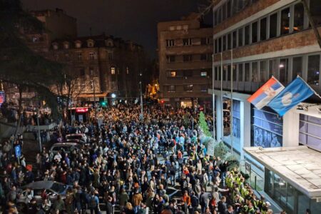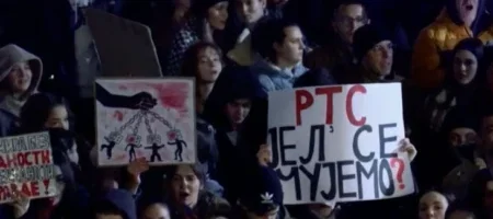 Студенти и граѓани се собраа вечерва пред зградата на Радио телевизија на Србија (РТС)на протест под слоганот „Наше право да…