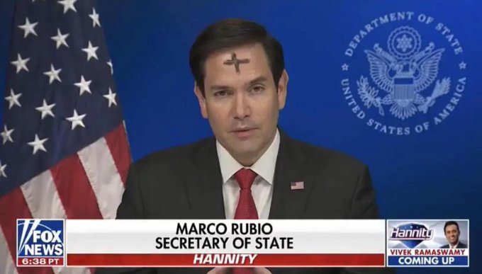 Американскиот државен секретар Марко Рубио се појави на „Фокс њуз“ со крст на челото.