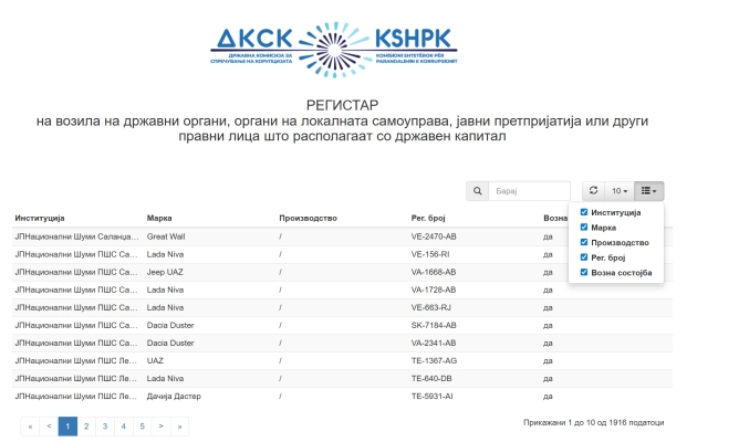 Во Регистарот на возила на државни органи, органи на локалната самоуправа, јавни претпријатија или други правни лица што располагаaт со државен капитал на Државната комисија за спречување на корупција во рамки на рокот предвиден со изборните дејствија за локалните избори на 19 октомври евидентирани се 1916 возила пријавени од страна на повеќе институции.